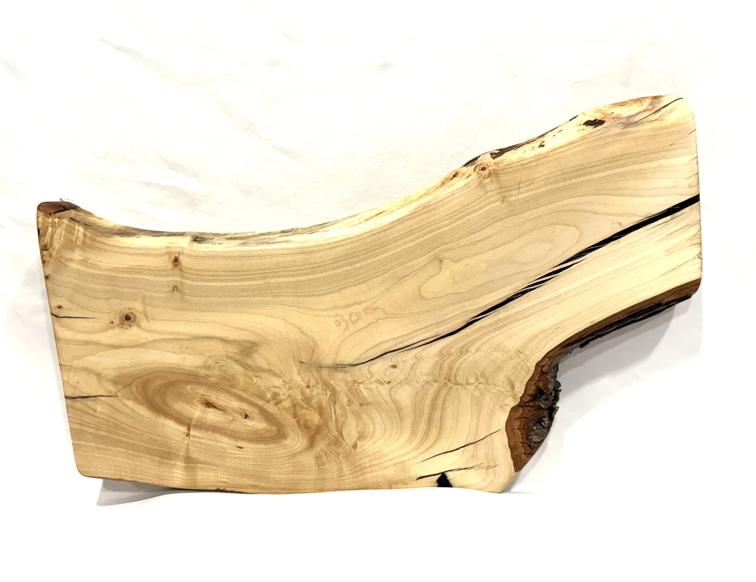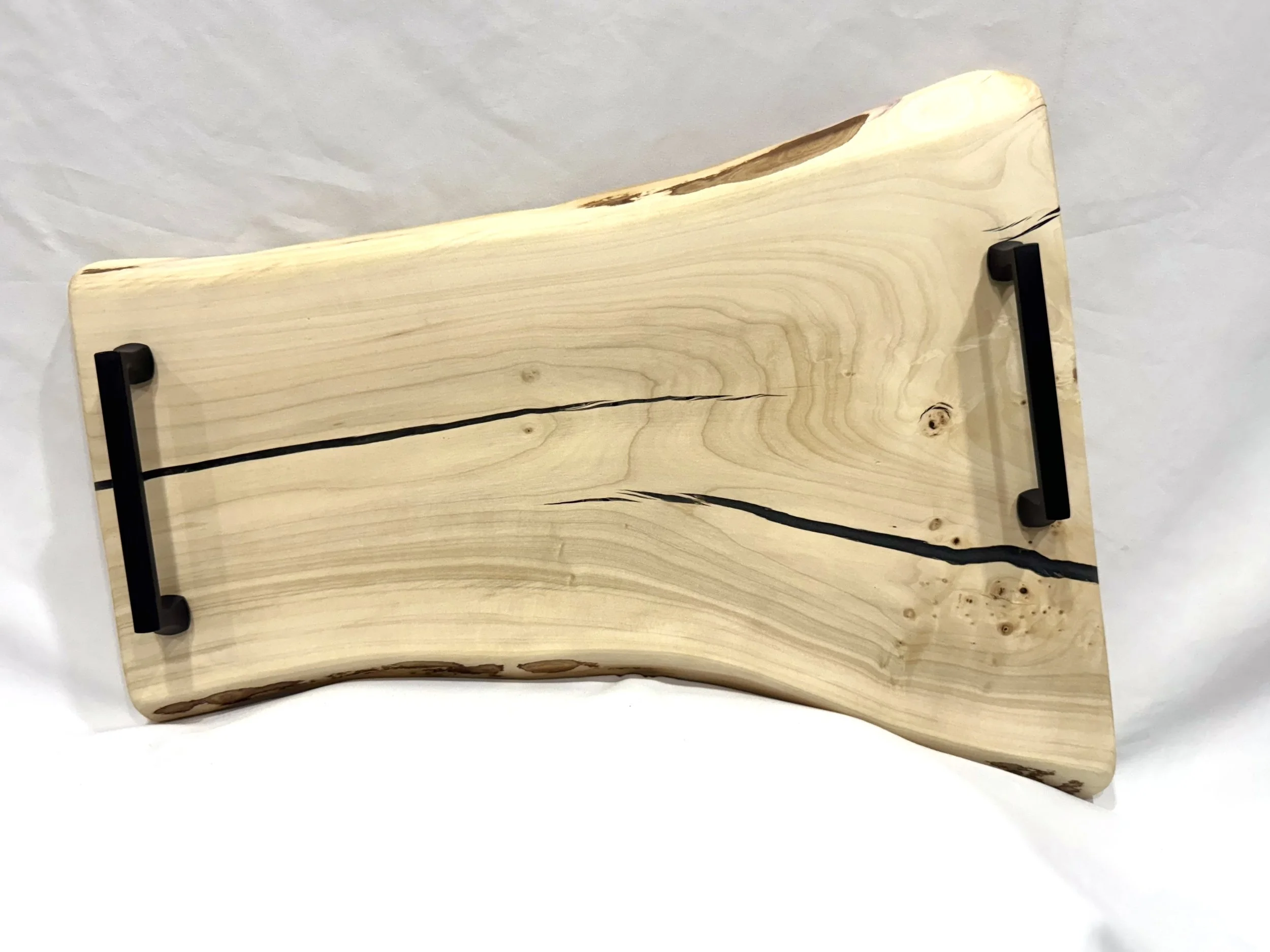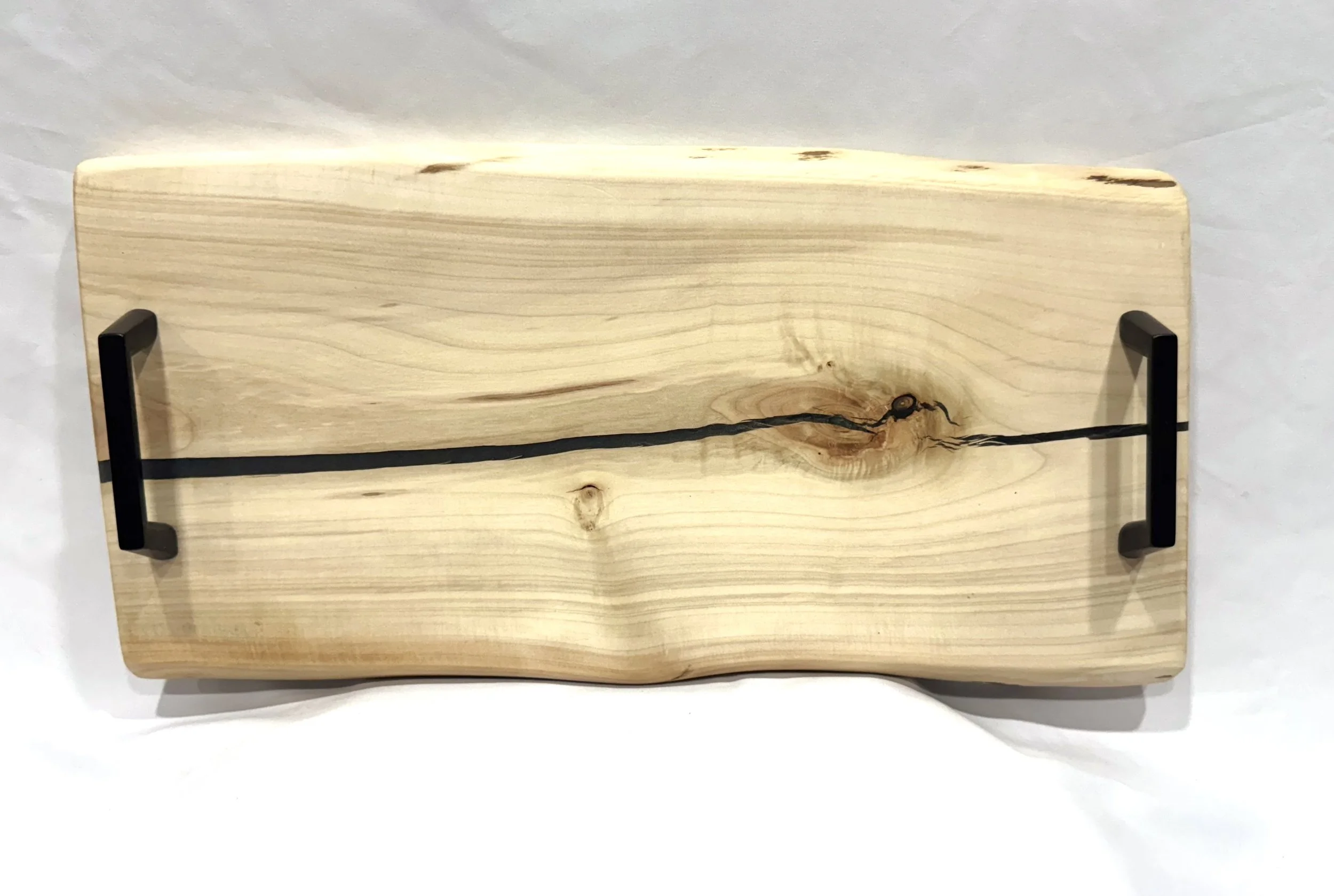 Live edge maple wood board with black resin filled in cracks.