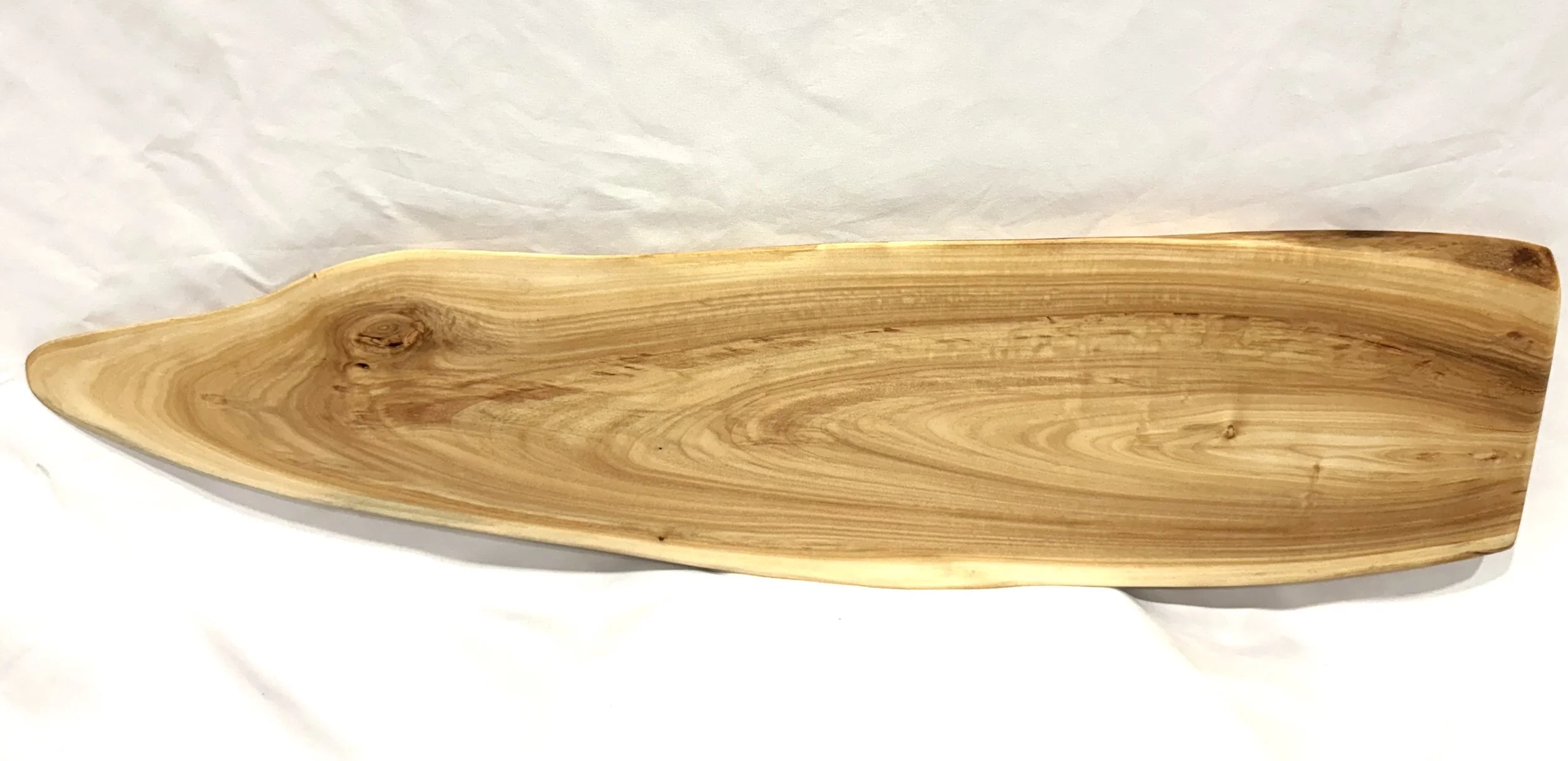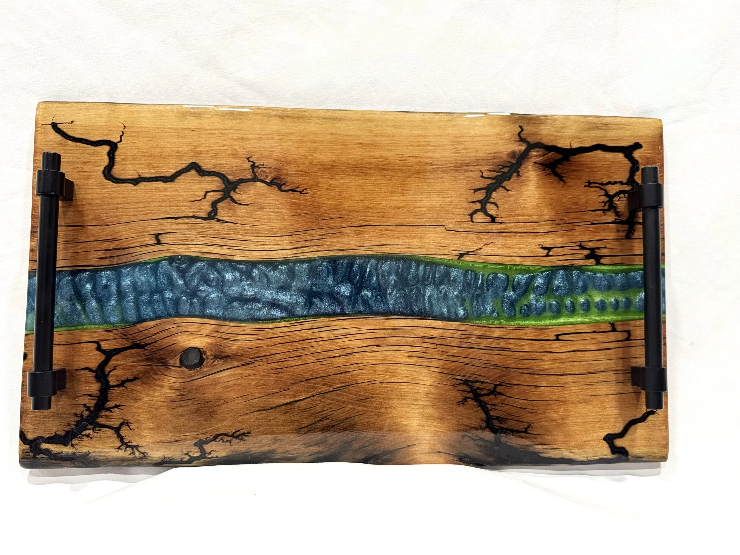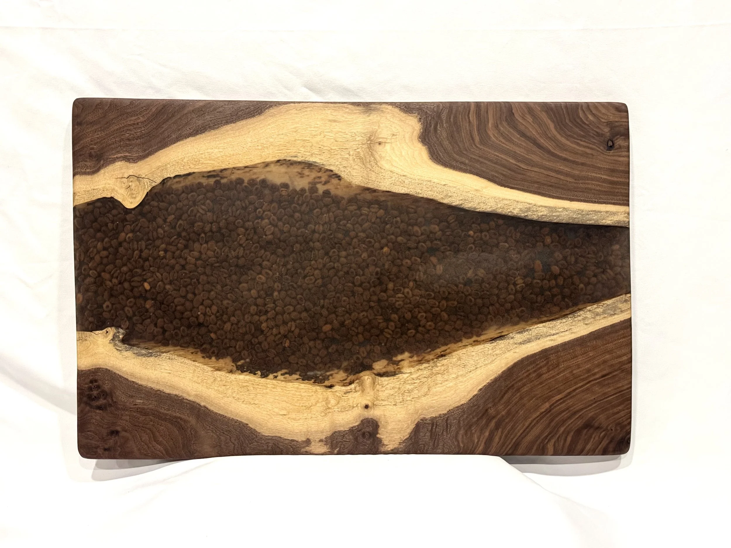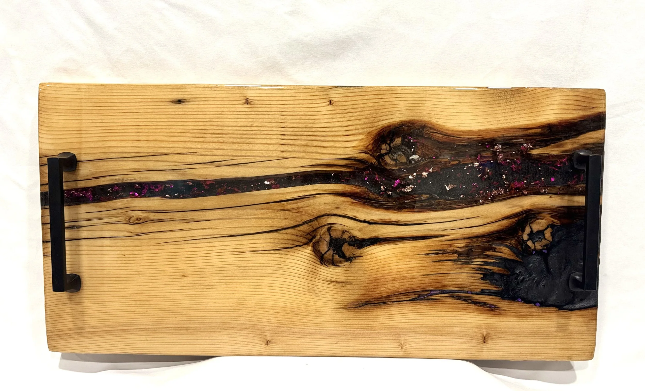 Live edge maple wood board with black resin filled in cracks.