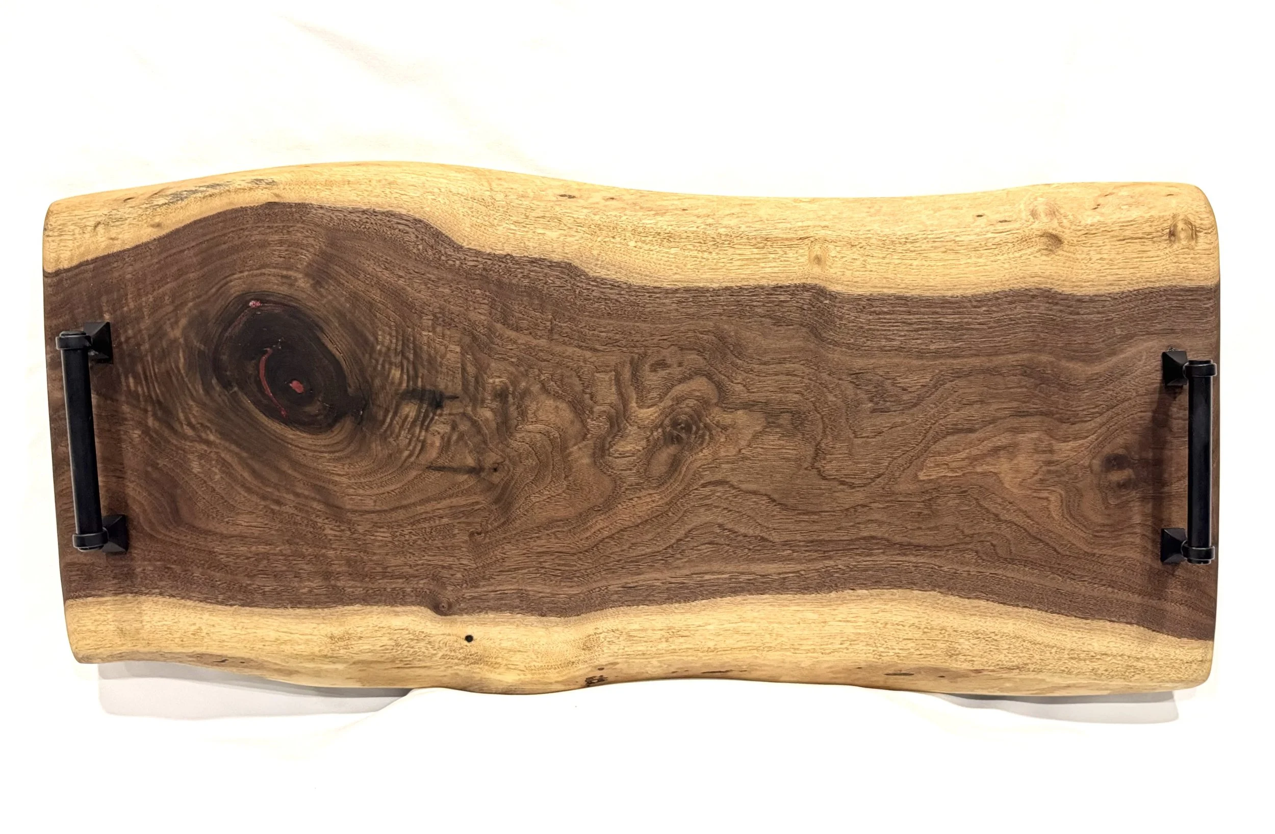 Black walnut board with red resin filled in knot.