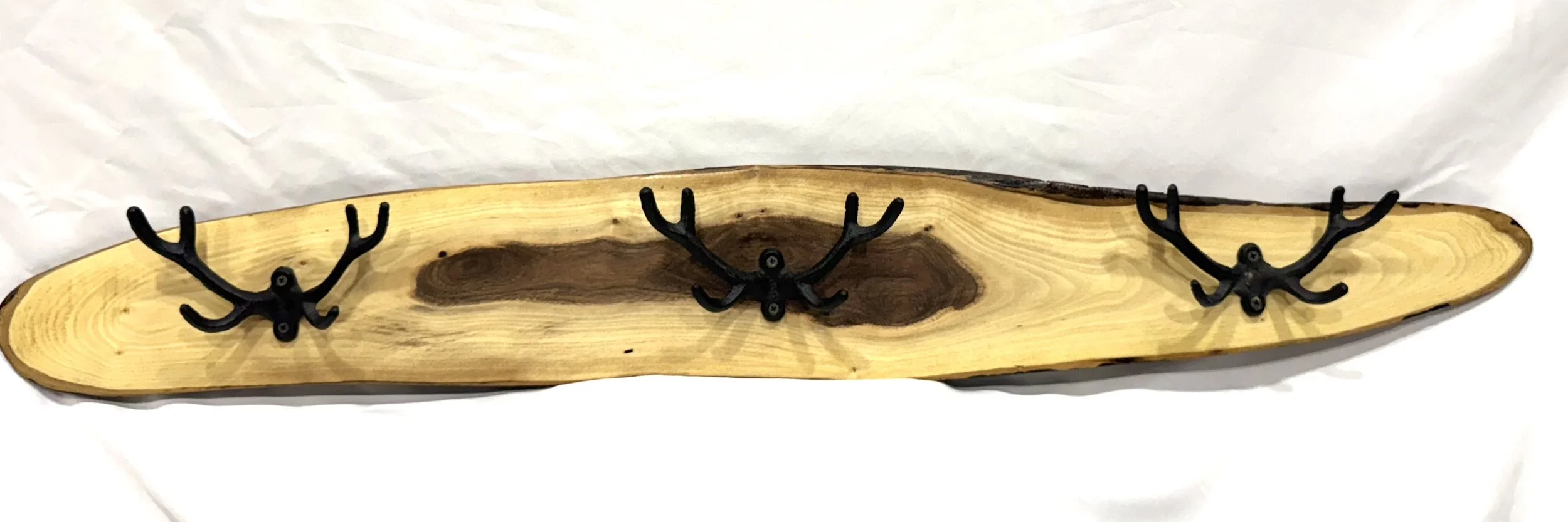 Black walnut coat rack, equipped with antler hangers.