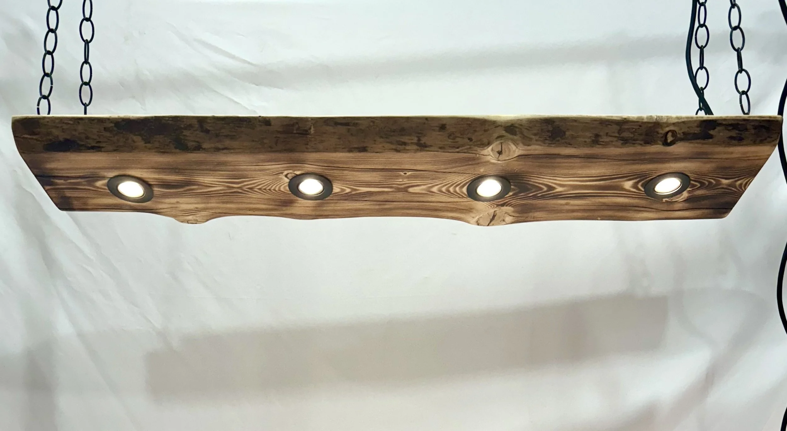 Engelmann spruce burned wood with lights mounted into wood. Designed to either plug into outlet or hardwired in.