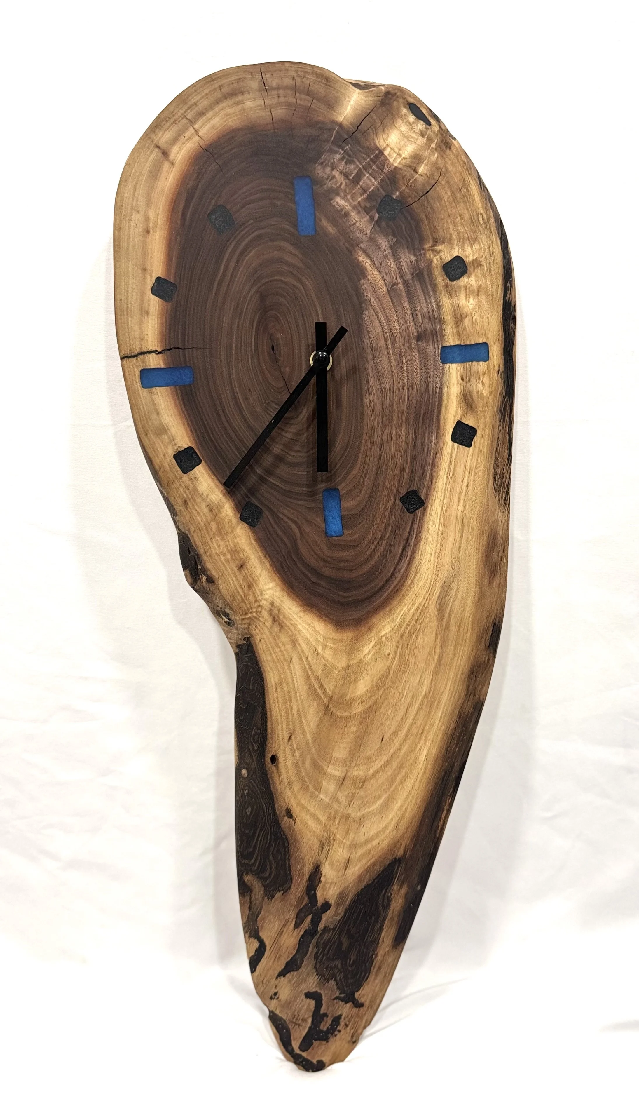 Black walnut clock with black and blue resin for numbers.