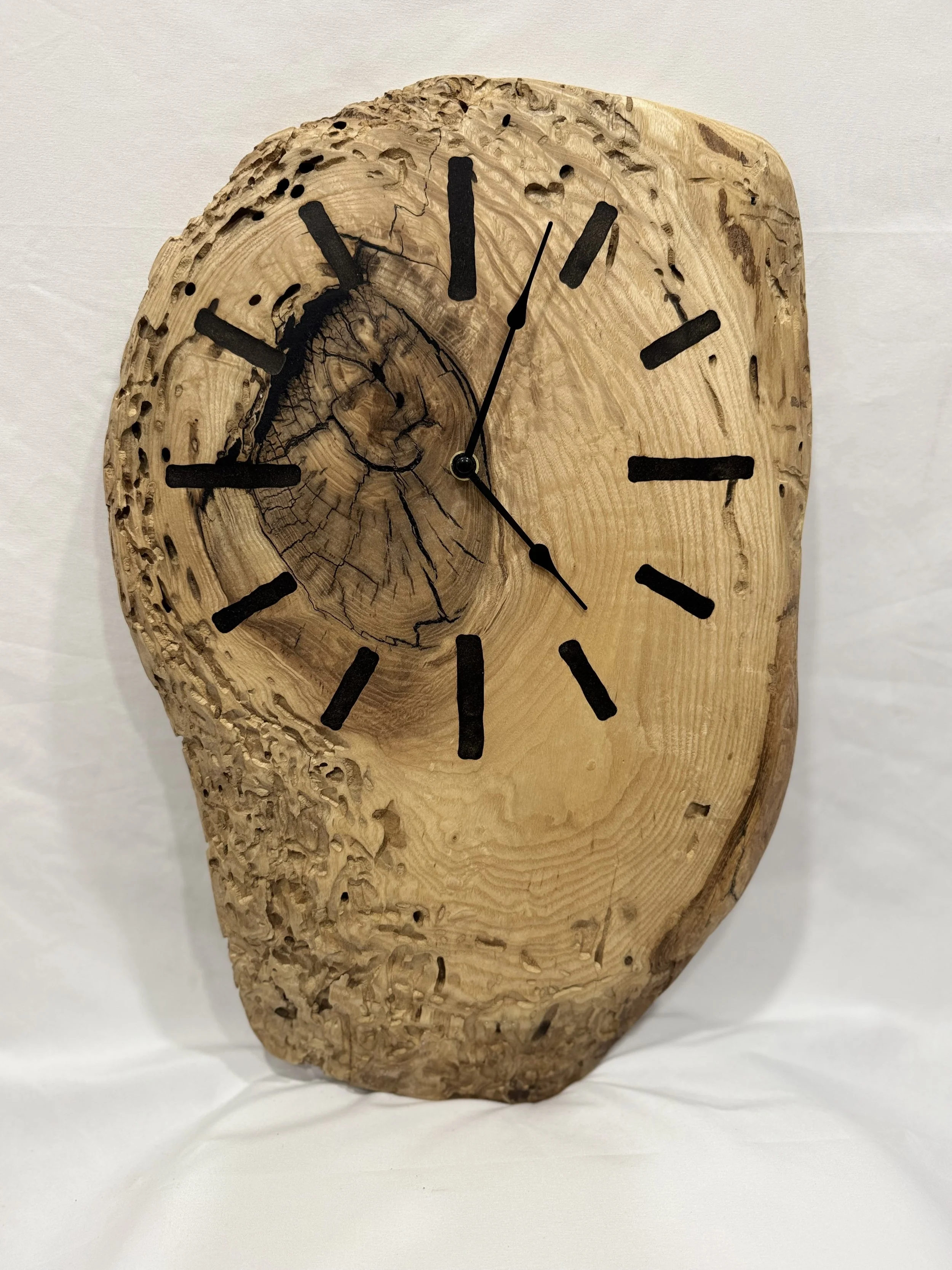 Ash wood clock with black resin for numbers.