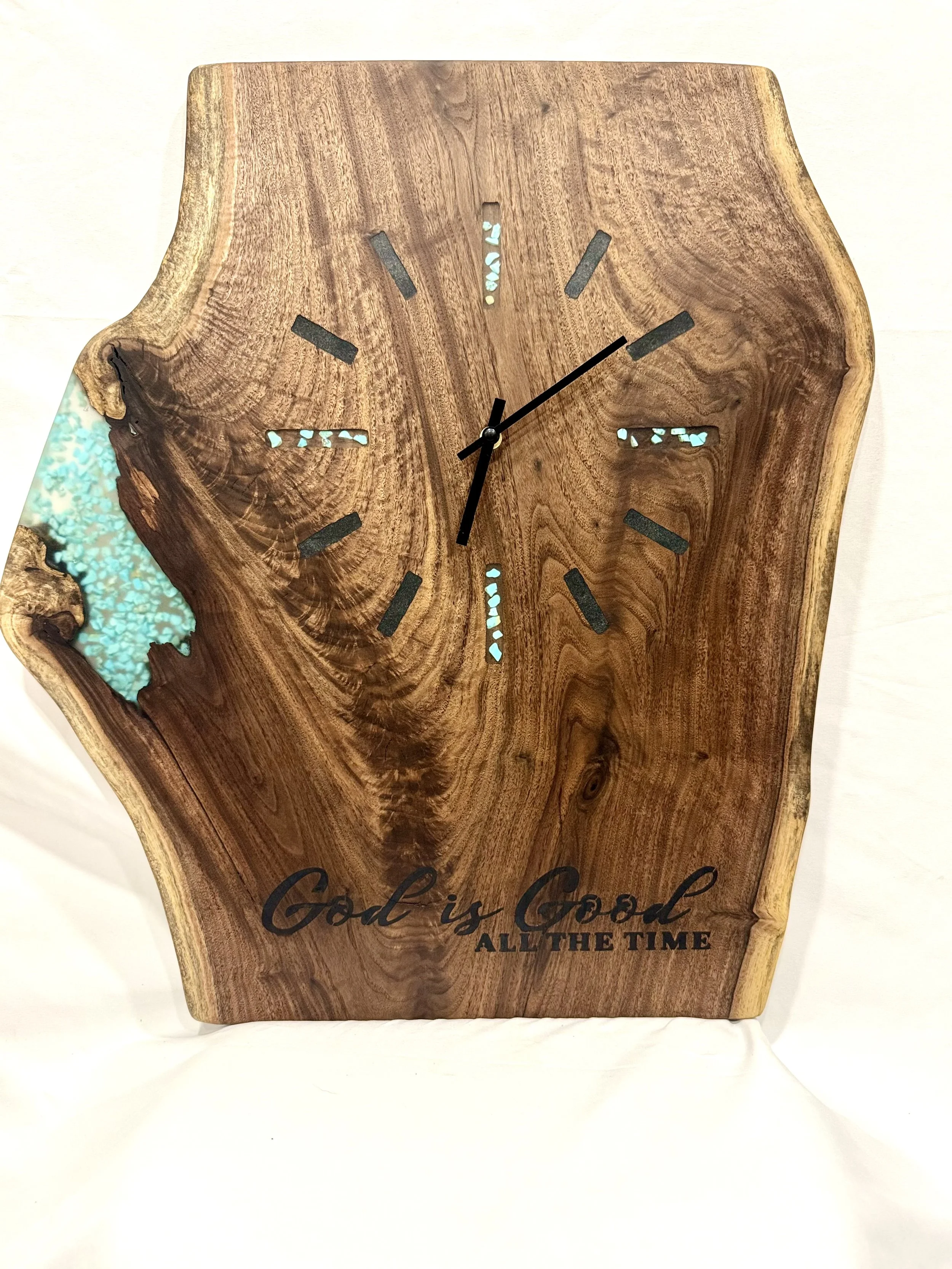 Black walnut clock with turquoise rocks in clear resin. God is good all the time burned into wood.